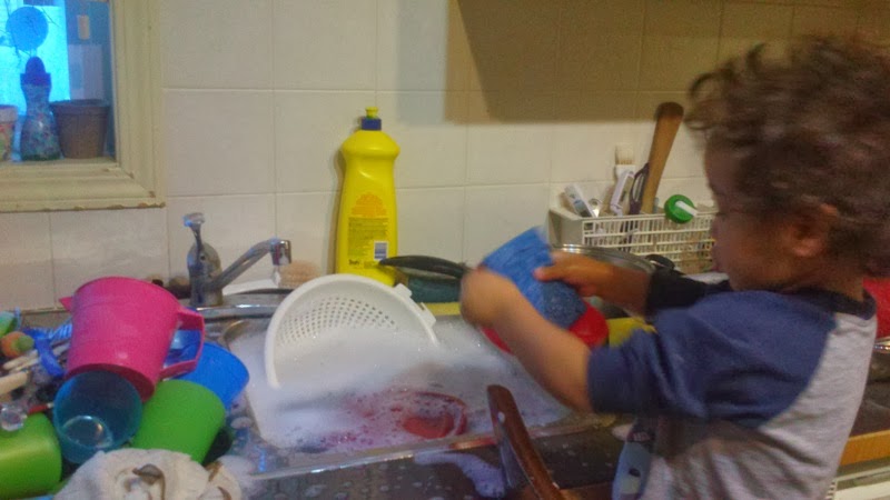 Itse sain perjantailta jääneiden tiskien tiskaukseen apupojan. Ja mikä onkaan hauskempaa kuin tiskata tälläisen iloisen 20-kuukautisen pojan kanssa. Mitä siitä, että tiskaus kestää kolme kertaa kauemmin ja lattia on täynnä vettä. Pojan motto oli "minä itse, äiti ei saa koskeakaan näihin tiskeihin". Laatuaikaa parhaimmillaan.